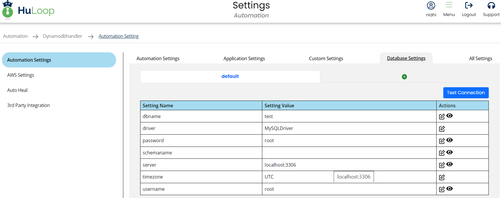 Here, DB setting name is defined under settings and this is the place where required data is given for the connection with database. Go to Settings > Automation Settings > DB Settings and provide the required details.