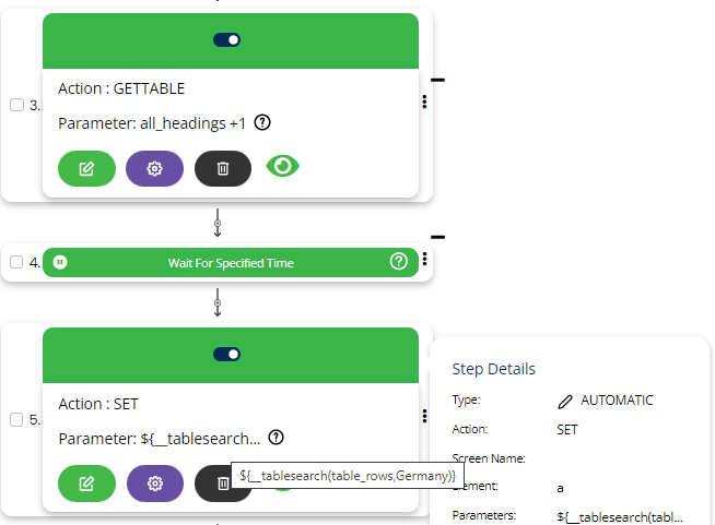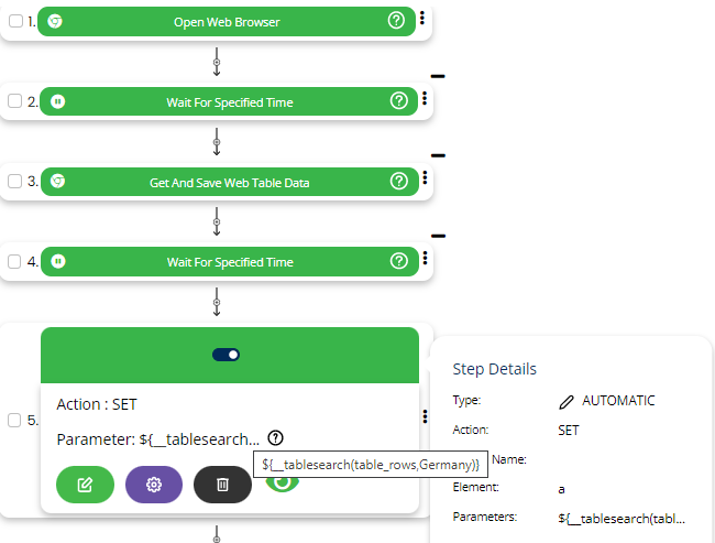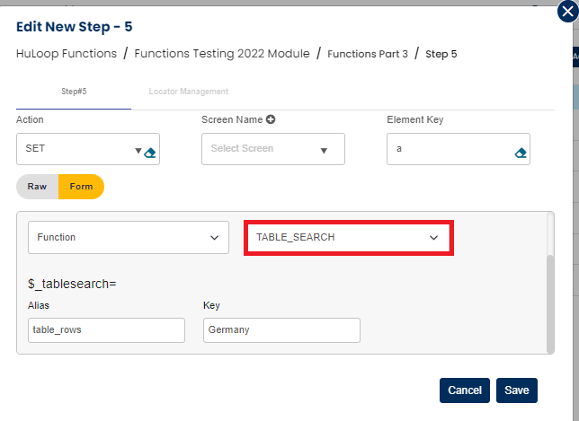 Select SET command from the action dropdown and provide a variable name in Element key, edit parameter section and click on Form, select functions from the dropdown and select TABLE_SEARCH function. Provide alias name and key to be searched.