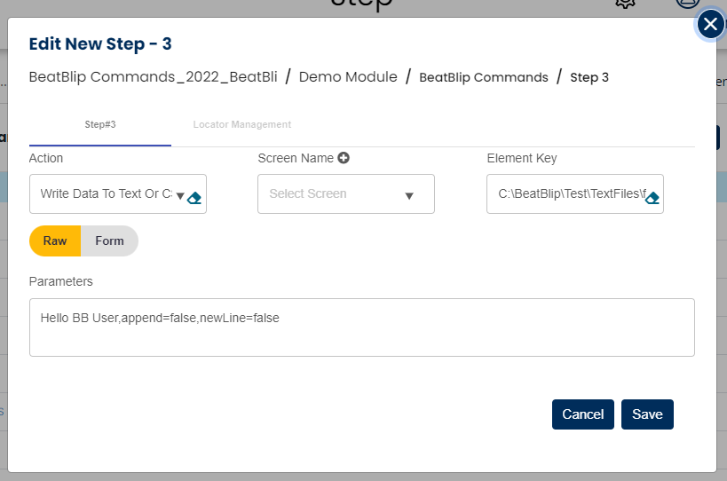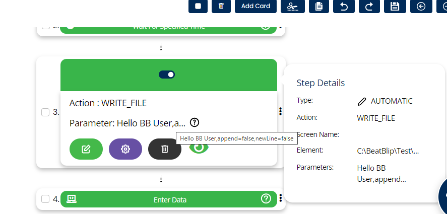 Select WRITE_FILE command from the action drop down, leave Screen name and Enter file path in Element field, Enter data, append value and newLine value in the parameter section as shown below: