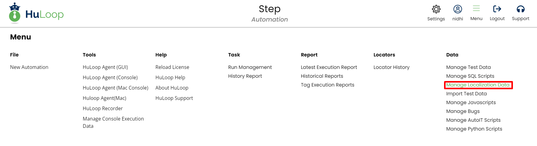To use Localization Data, you need to select the automation then click on Menu, under Data section click on Manage Localization Data.