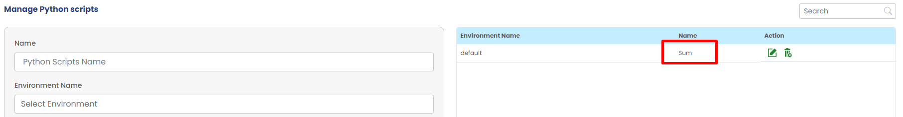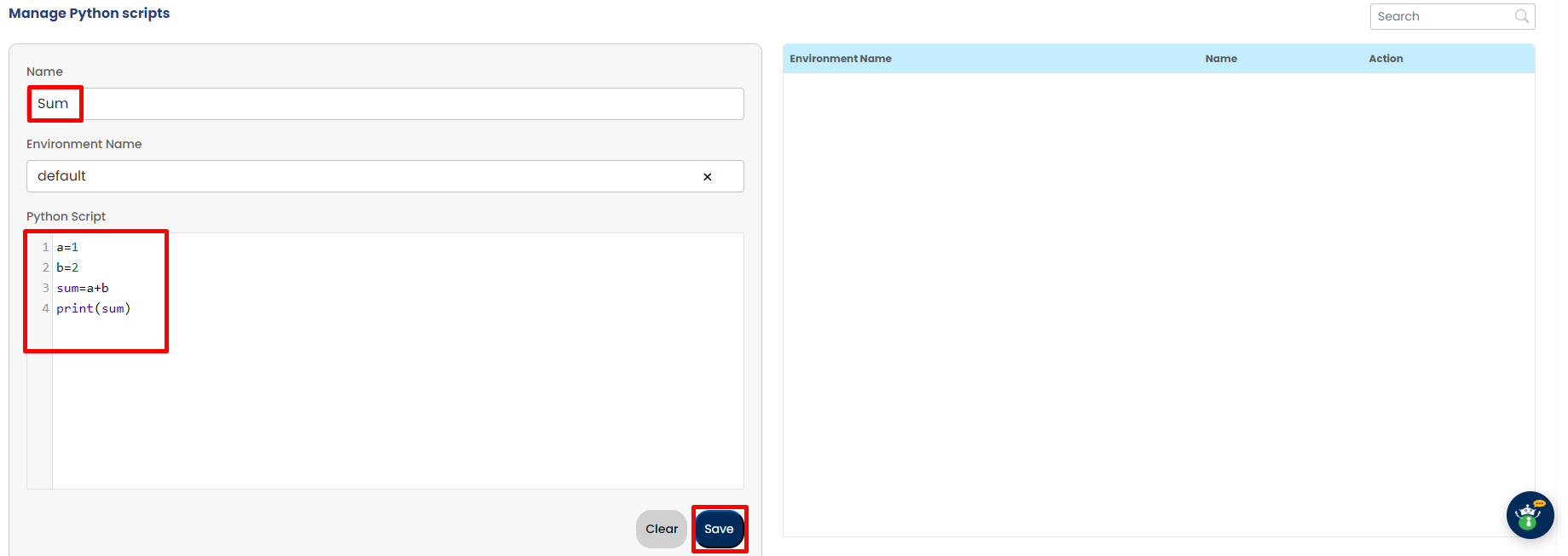 To enter Python scripts, enter the name of script, provide environment name, enter Python scripts and then save it.
