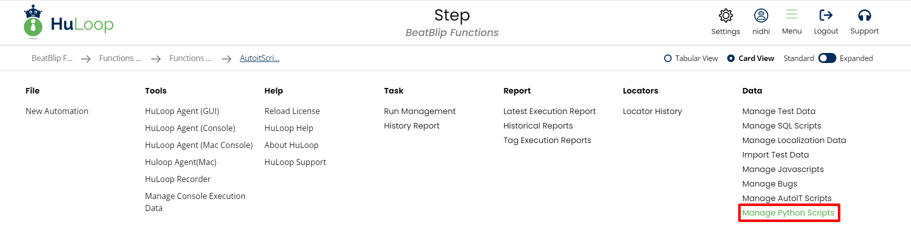 To create Python script you need to select the automation then click on Menu, under Data section click on Manage Python Scripts.