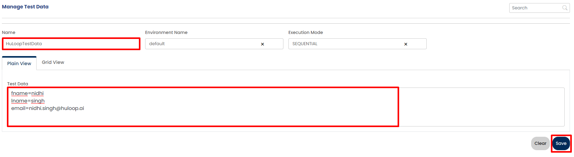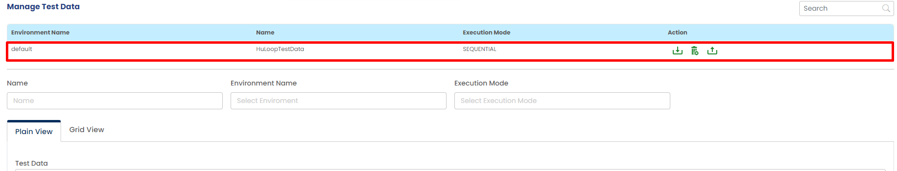 To create test data, you need to provide, test data name, environment name, execution mode and enter the test data.