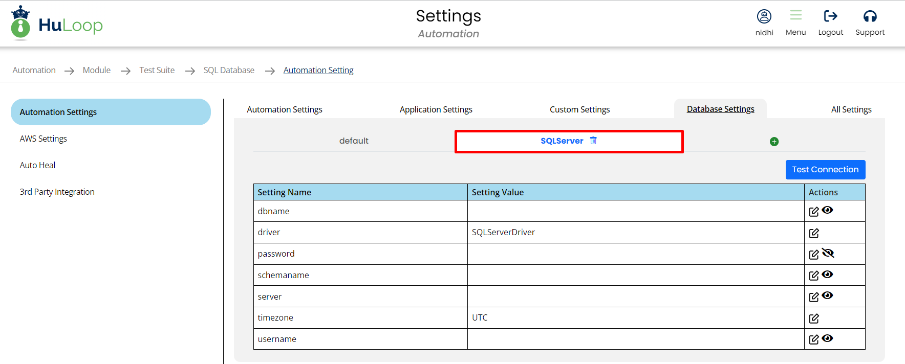 Step 3: Now click on the + icon just beside ‘default’, a new tab will be opened as shown in the below snapshot. Enter the name of this DB setting and details here for connecting second database with HuLoop.