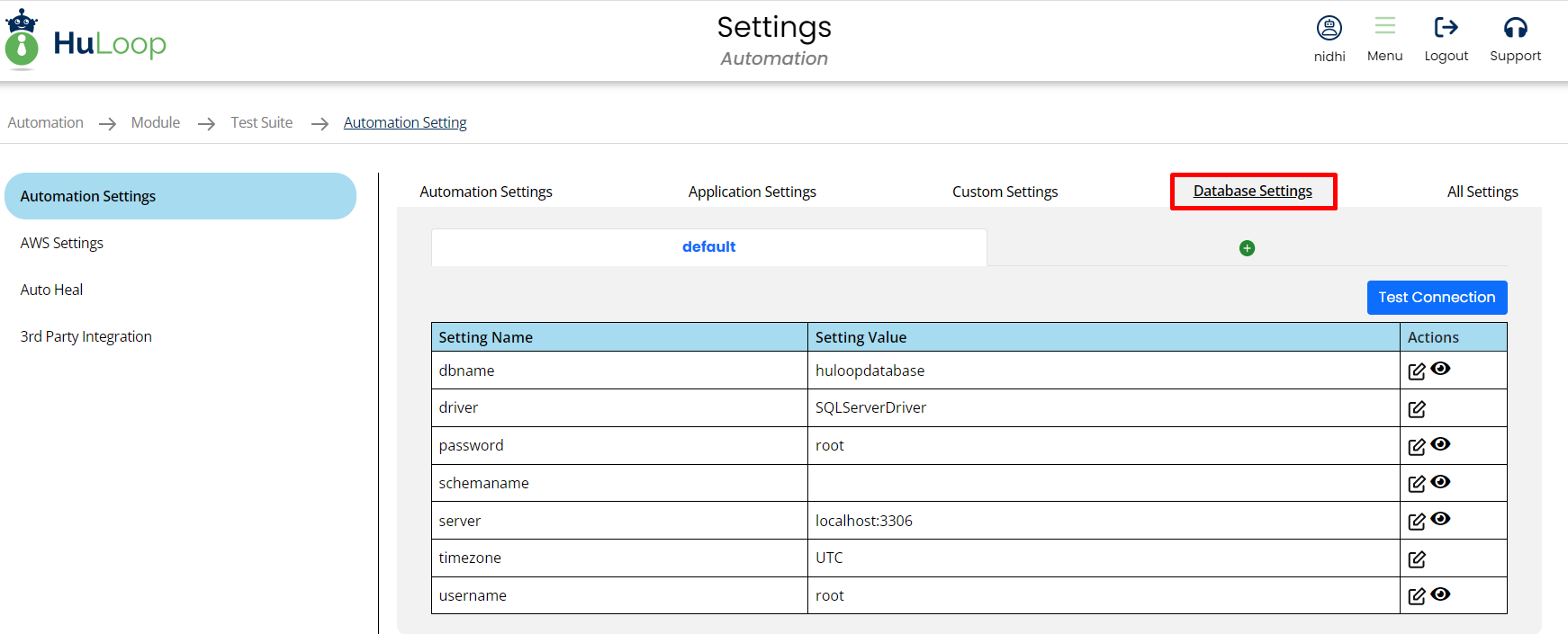 Step 3: Now click on the + icon just beside ‘default’, a new tab will be opened as shown in the below snapshot. Enter the name of this DB setting and details here for connecting second database with HuLoop.