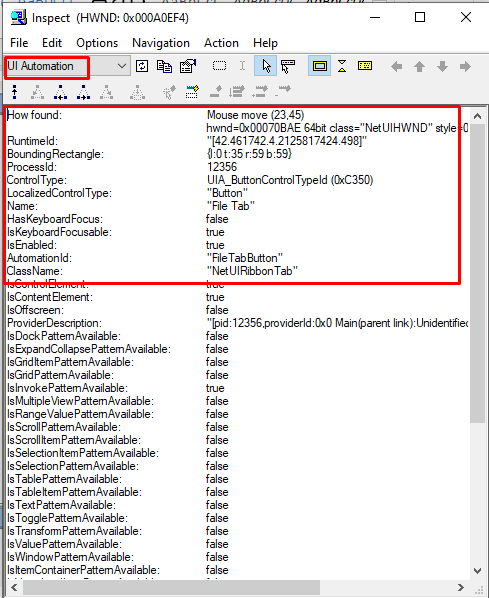 Inspect is a Windows-based tool that enables users to select any UI element and view the element’s accessibility data. You can view UI Automation properties and control patterns, as well as Microsoft Active Accessibility properties.