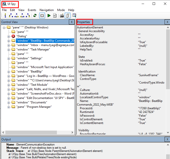UI SPY is a utility tool for finding relevant information of various desktop applications. You can view UI Automation properties and control patterns of the applications.