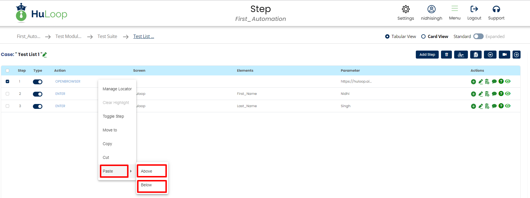 Note: The order in which multiple steps or cases are selected to be copied , will be pasted in the exact same order.