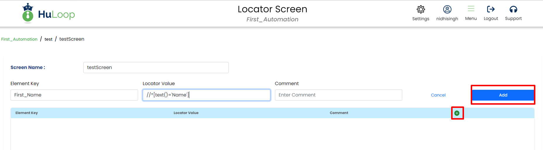 To add locators in screen: