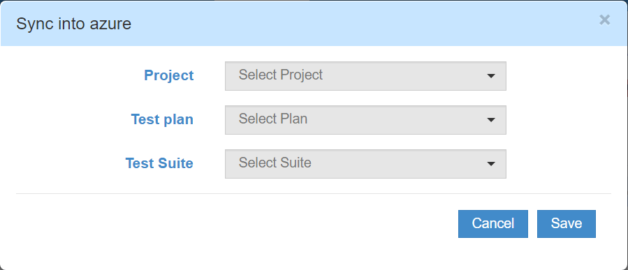 8. Once you click on this icon, it will give you a form to select your Azure project, test plan and test suite.