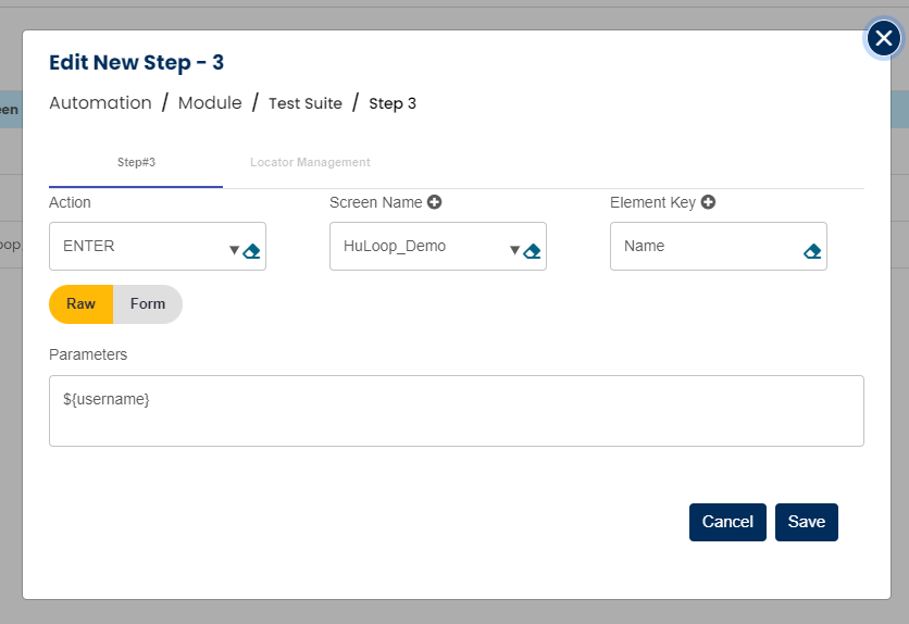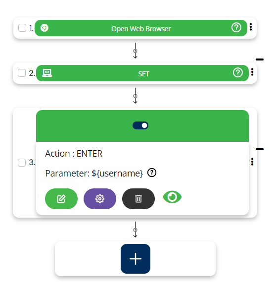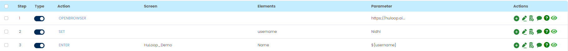 Action/command will be SET, screen name will be blank, variable name will go into Element and its value will go in the parameters as shown in step 2 in above snapshot.