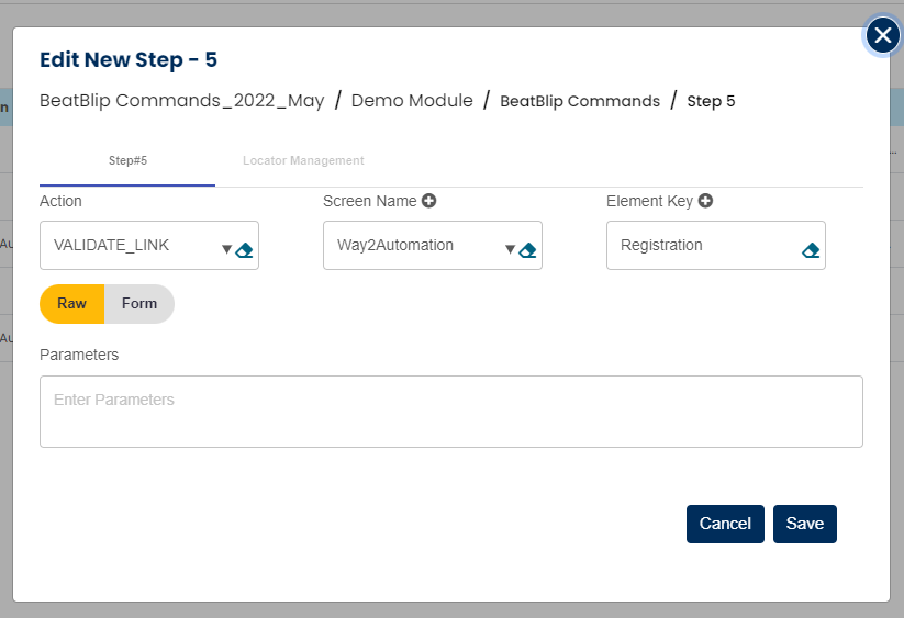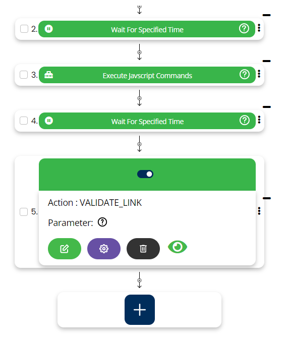Select VALIDATE_LINK command from the action drop down, select desired Screen name, Element key (should be representing a link) and leave the parameter section blank as shown below: