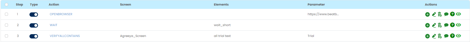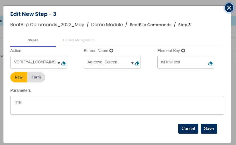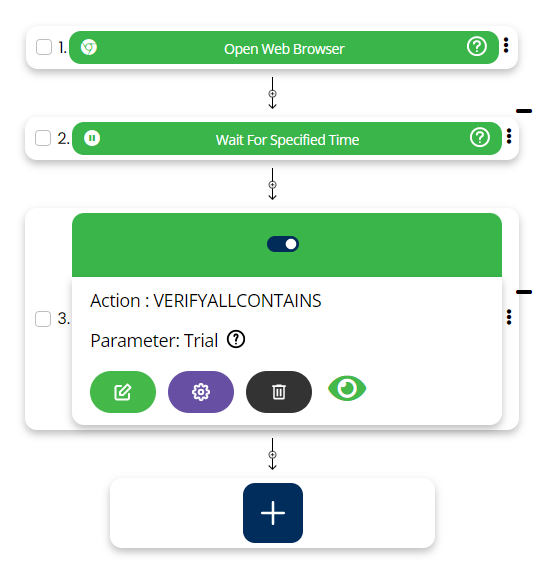 Select VERIFYALLCONTAINS command from the action drop down, select desired Screen name, Element key and provide the string or substring in the parameter section as shown below: