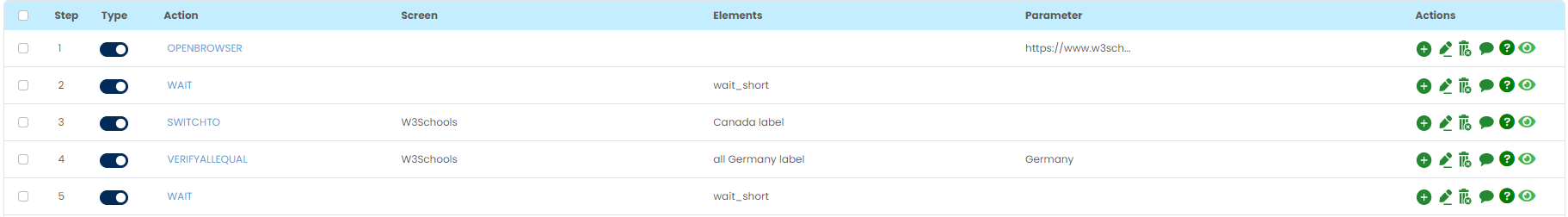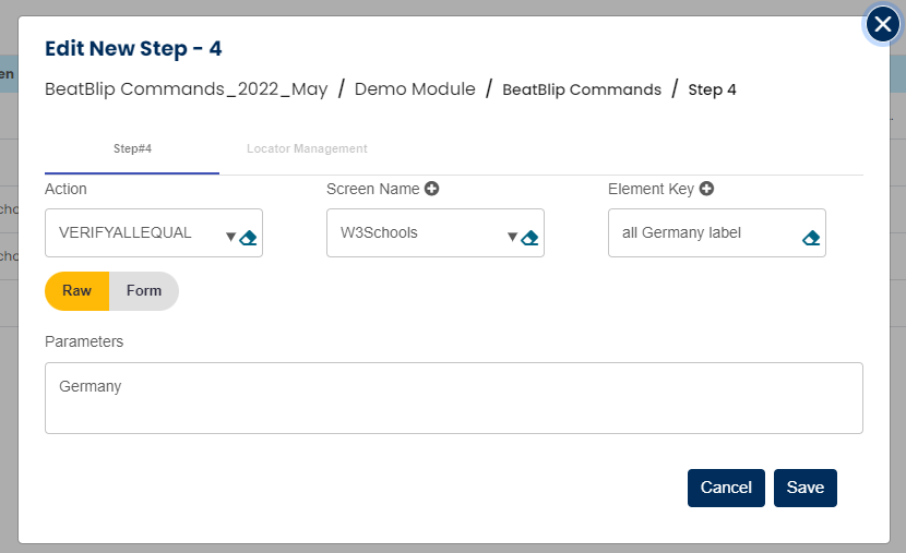 Select VERIFYALLEQUAL command from the action drop down, select desired Screen name, Element key and leave parameter section blank as shown below: