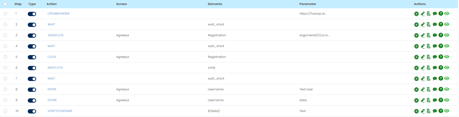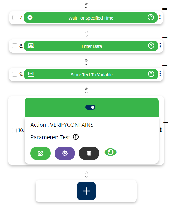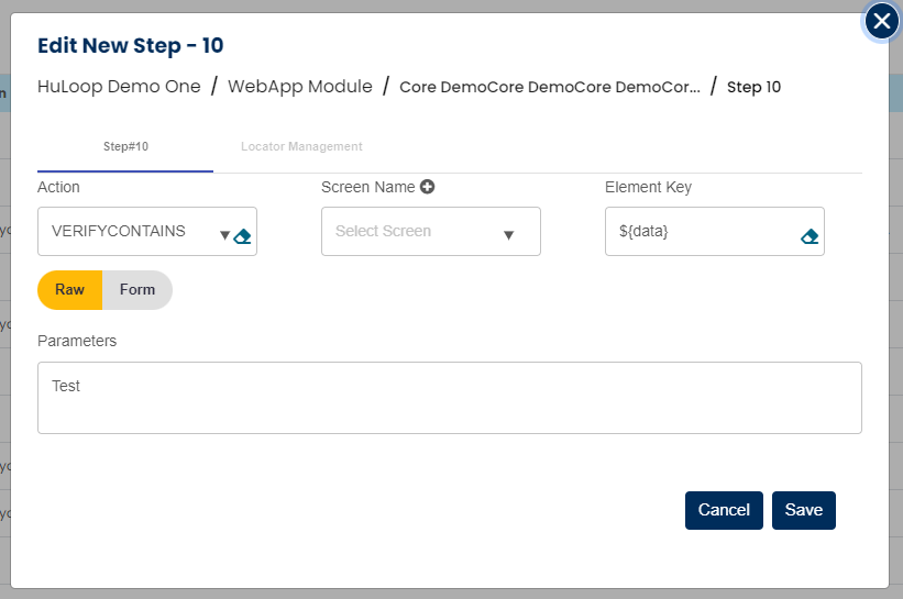 Select VERIFYCONTAINS command from the action drop down, select desired Screen name, Element key and provide the string or substring in the parameter section as shown below:
