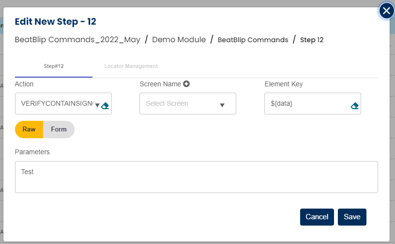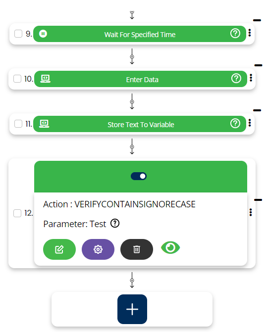 Select VERIFYCONTAINSIGNORECASE command from the action drop down, select desired Screen name, Element key and provide the string or substring in the parameter section as shown below: