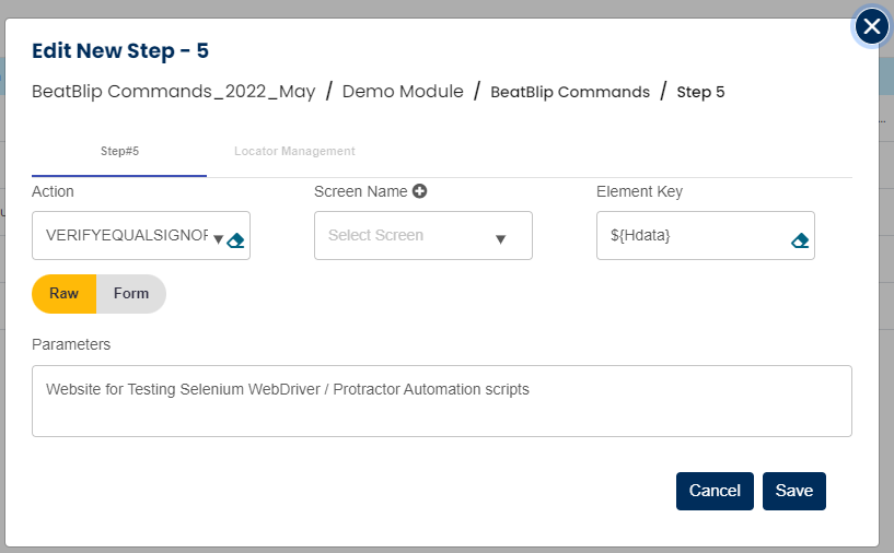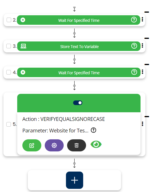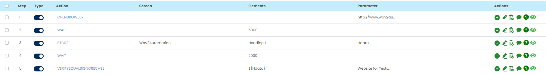VerifyEqualIgnoreCase command is used to compare and verify the equality of two text values ignoring the case sensitivity. The left hand values is provided in element section and the right hand value is in parameter section. In case locator(page and element) is provided then the LHS will be the text value in the locator.
