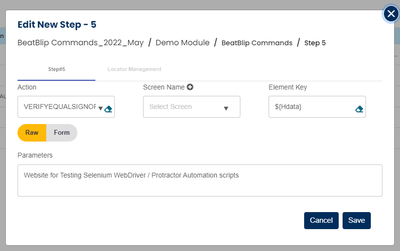 VerifyEqualsIgnoreCase command is used to compare and verify the equality of two text values ignoring the case sensitivity. The left hand values is provided in element section and the right hand value is in parameter section. In case locator(page and element) is provided then the LHS will be the text value in the locator.
