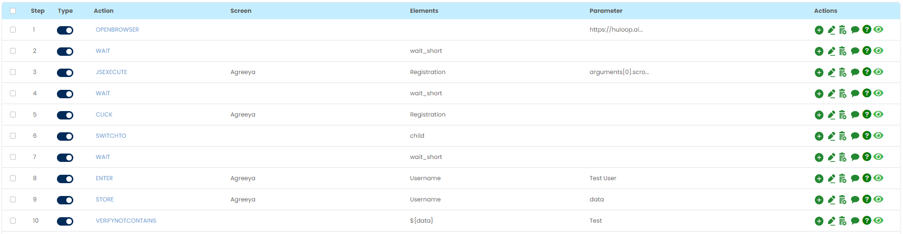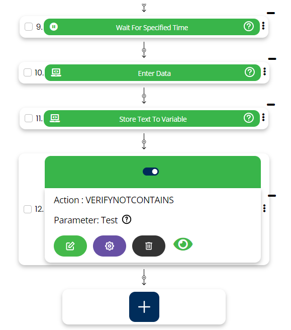 Select VERIFYNOTCONTAINS command from the action drop down, select desired Screen name, Element key and provide the string or substring in the parameter section as shown below: