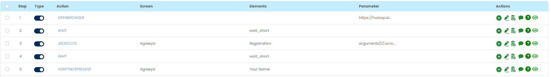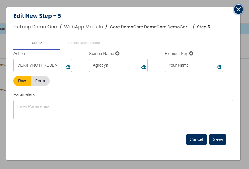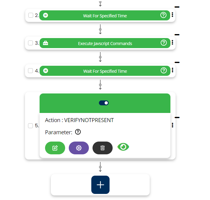 Select VERIFYNOTPRESENT command from the action drop down, select desired Screen name, Element key and leave the parameter section blank as shown below: